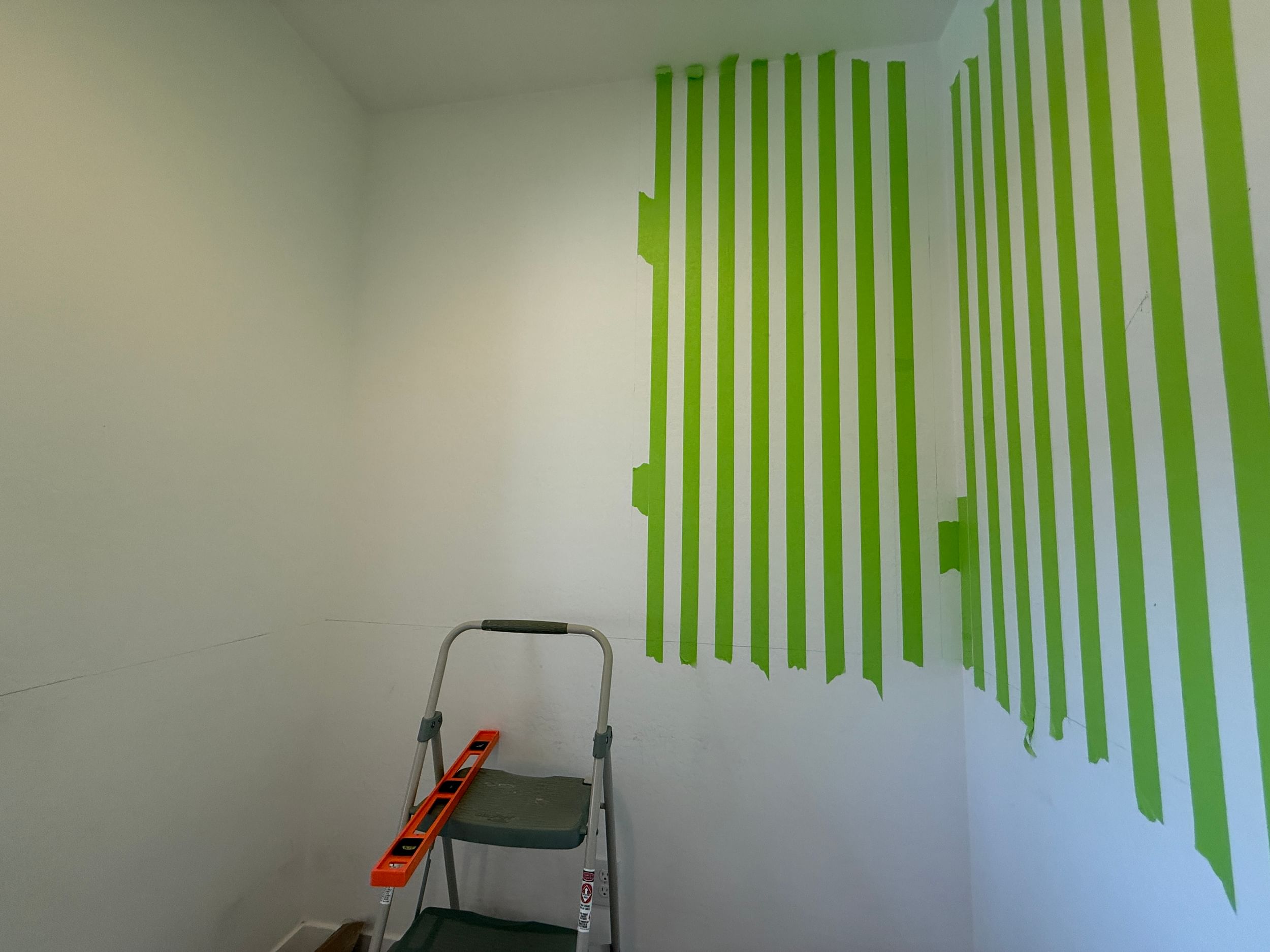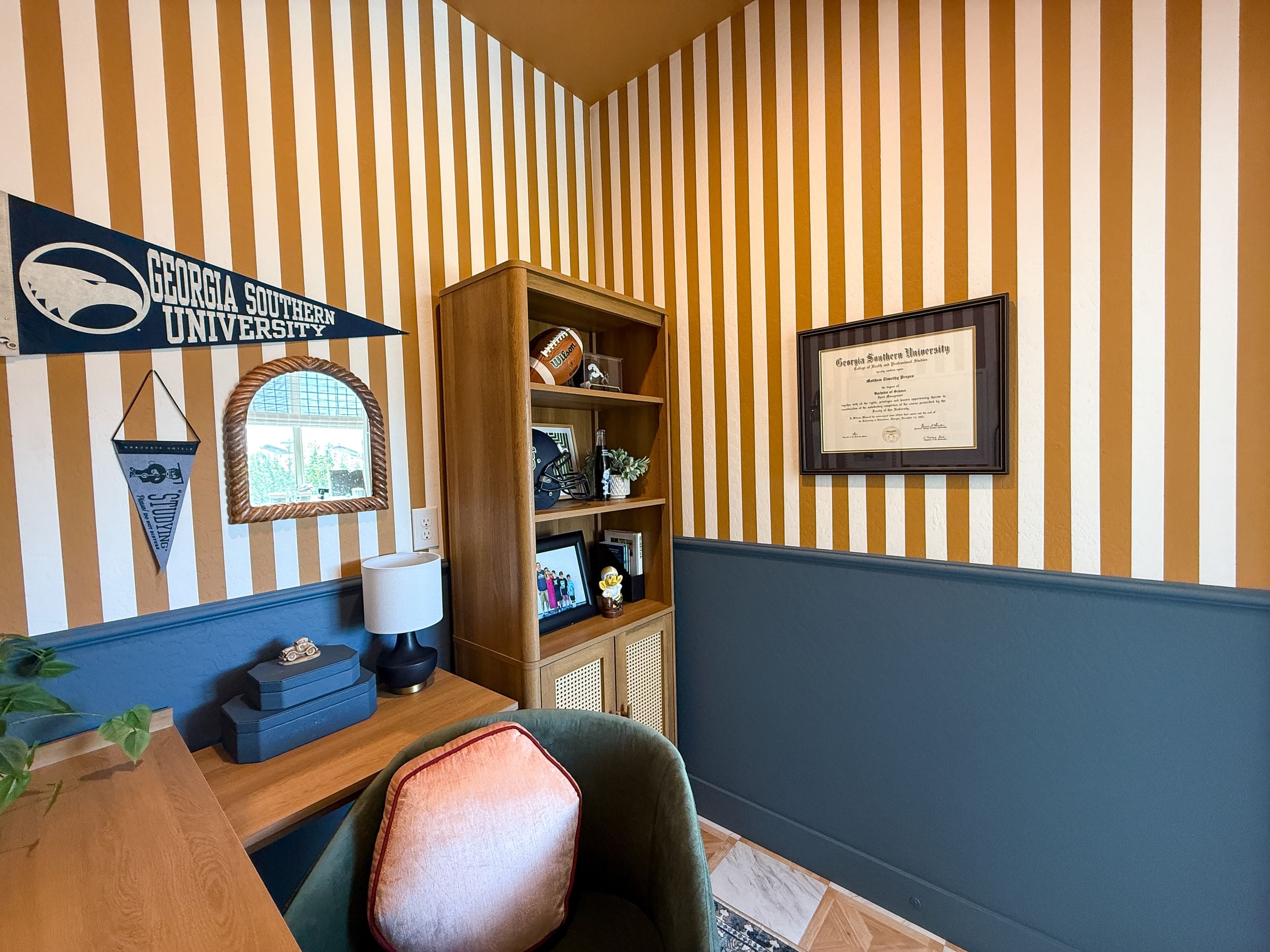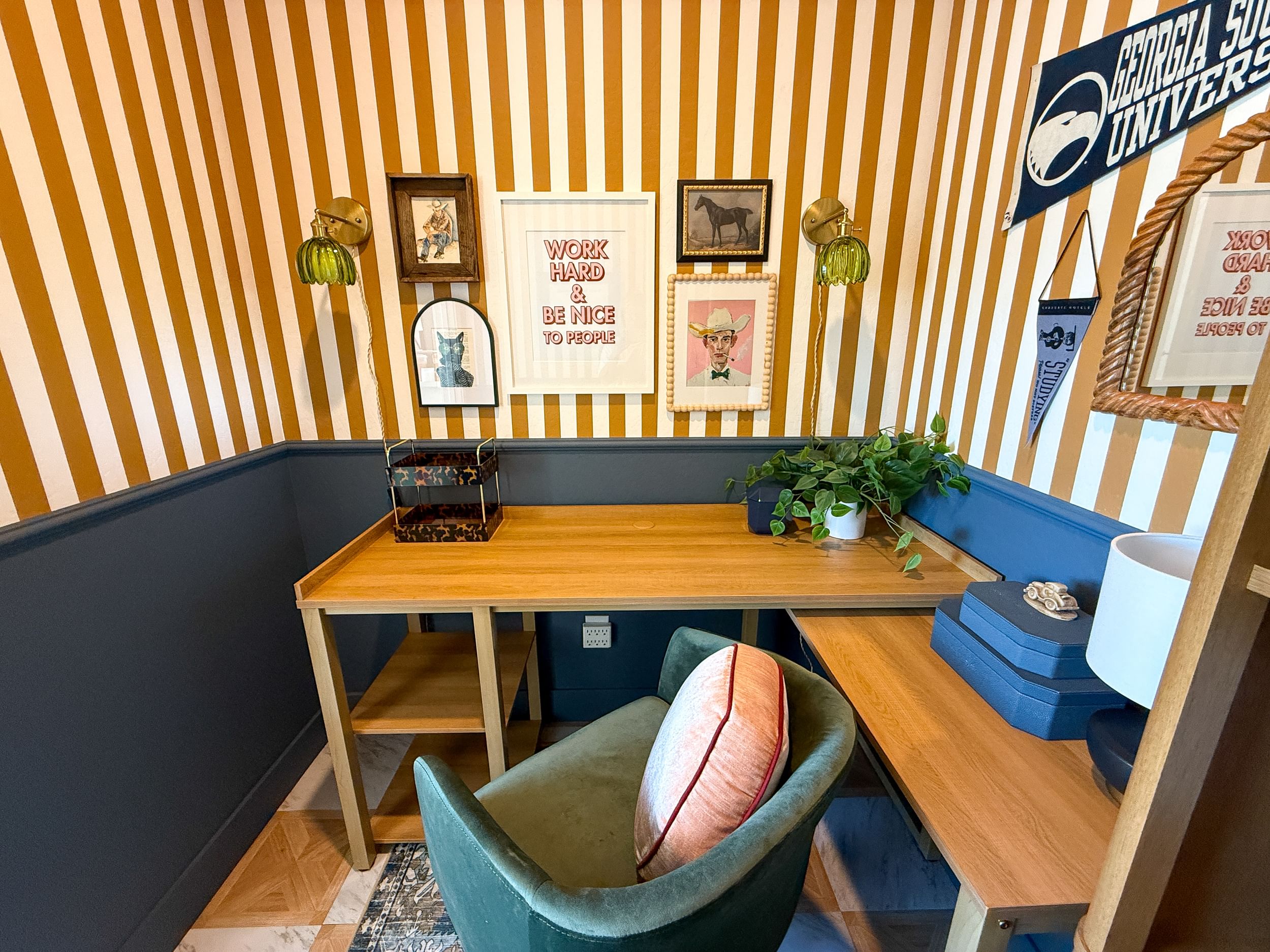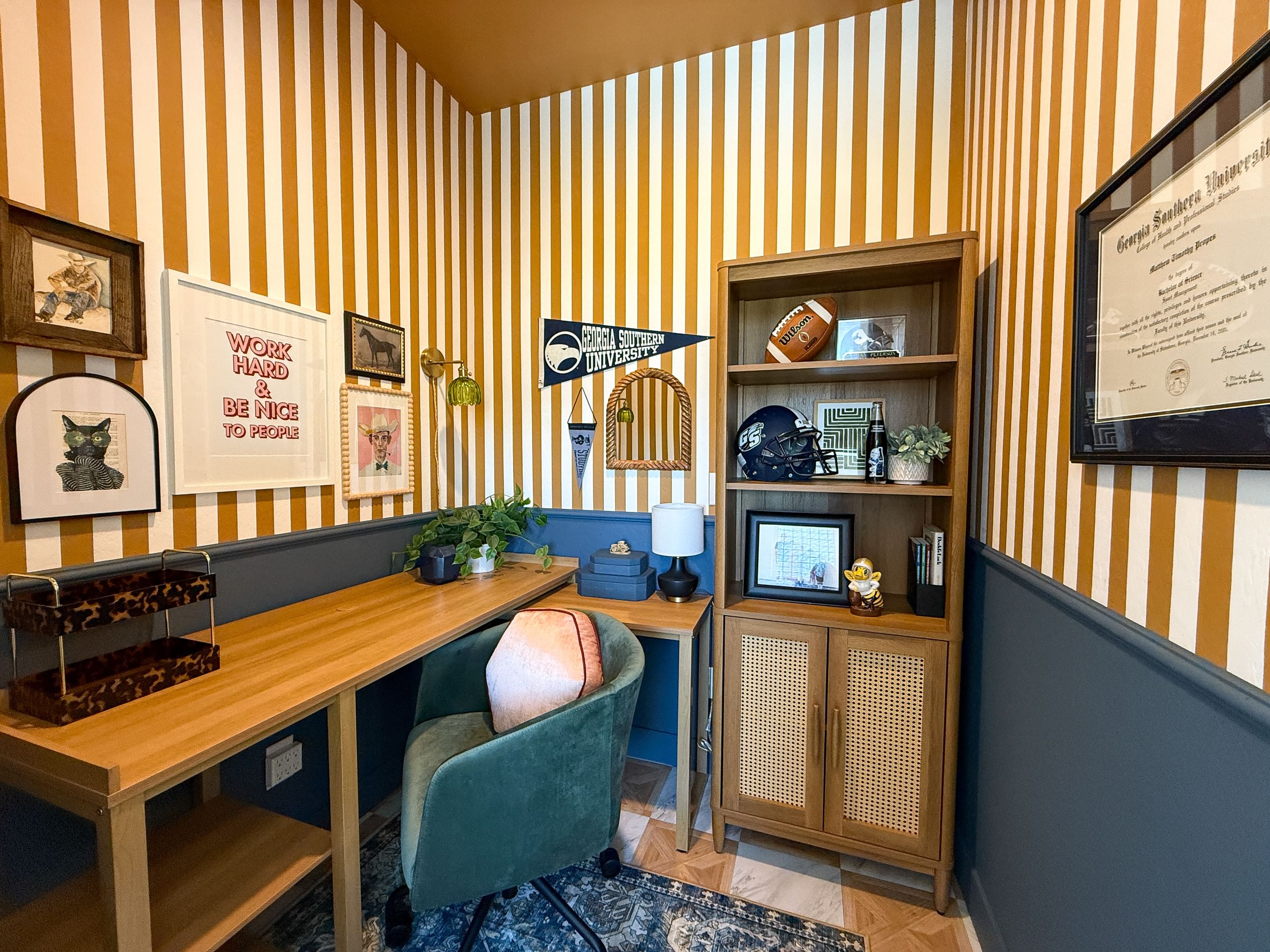 Rebecca turns a tiny space into a bold, color-drenched office, complete with crisp pinstripes and big personality.