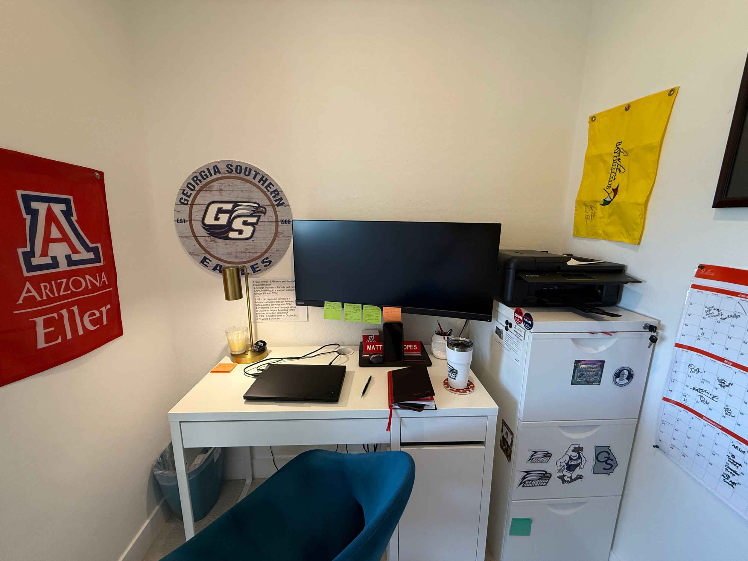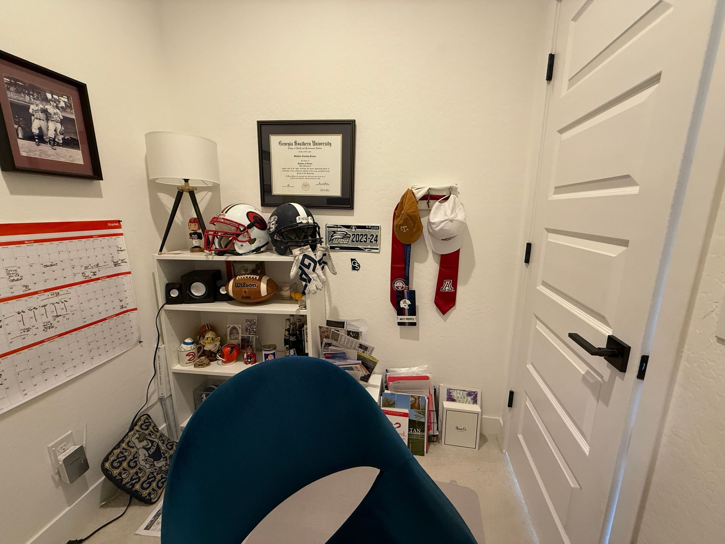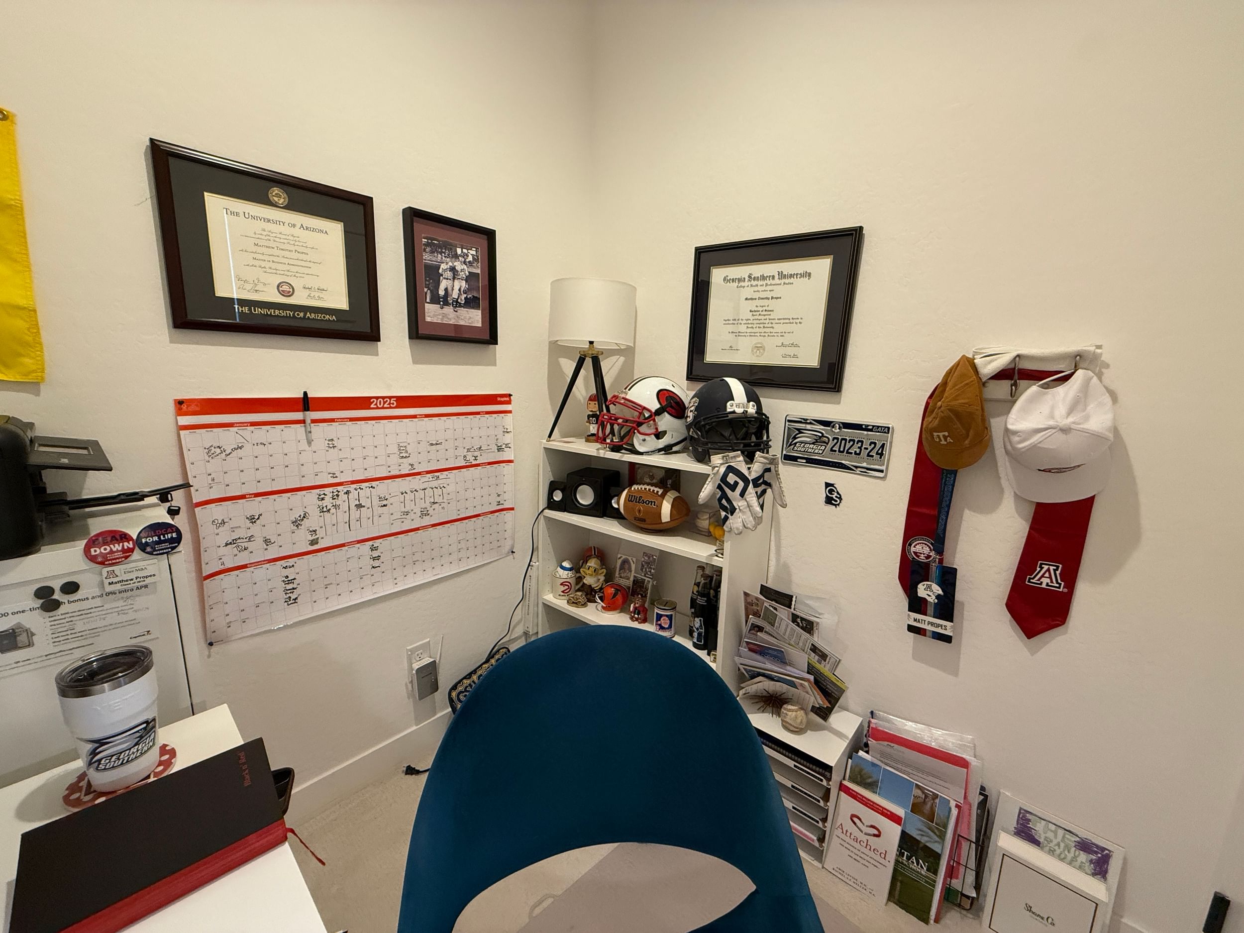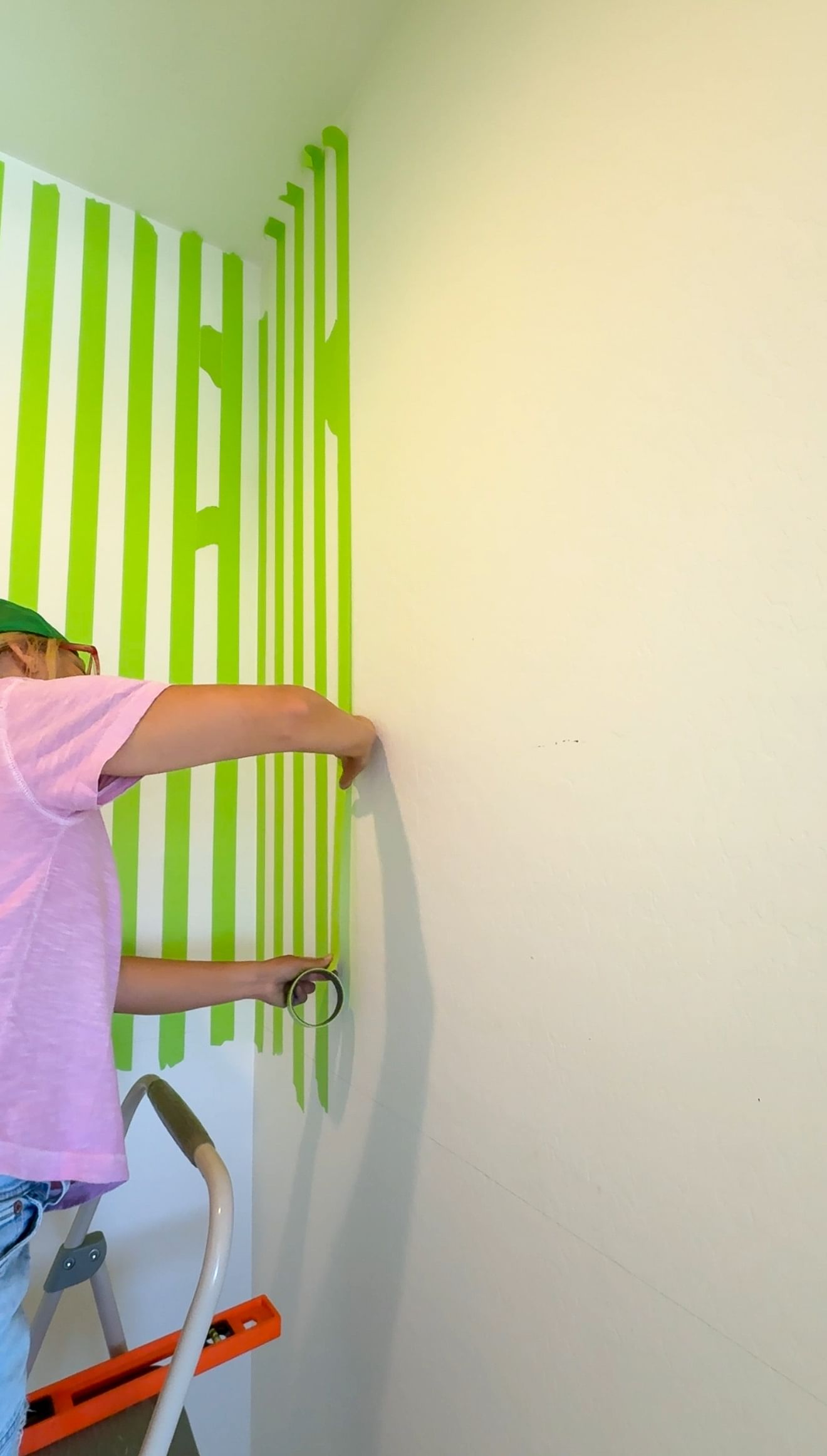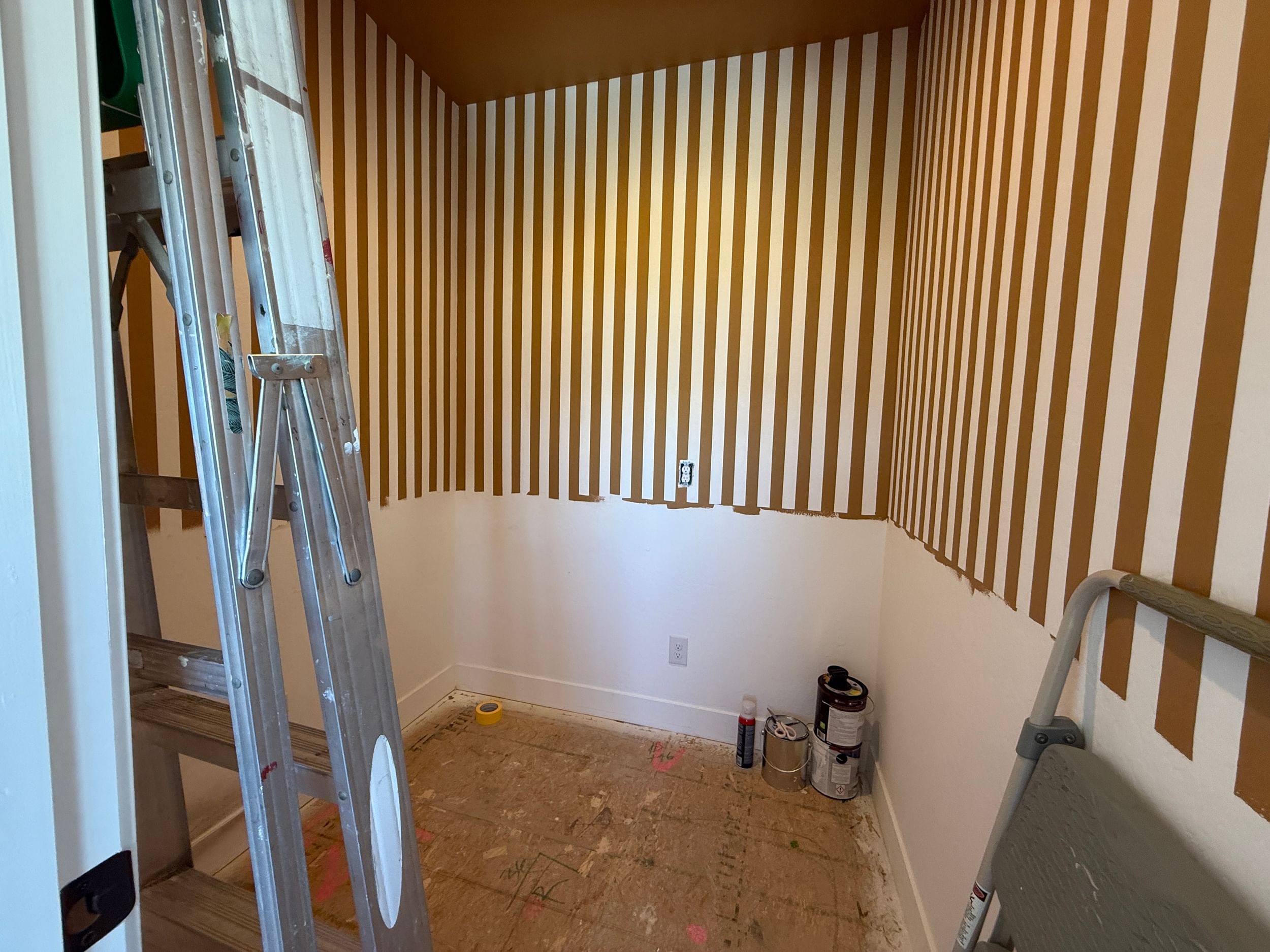 Rebecca turns a tiny space into a bold, color-drenched office, complete with crisp pinstripes and big personality.