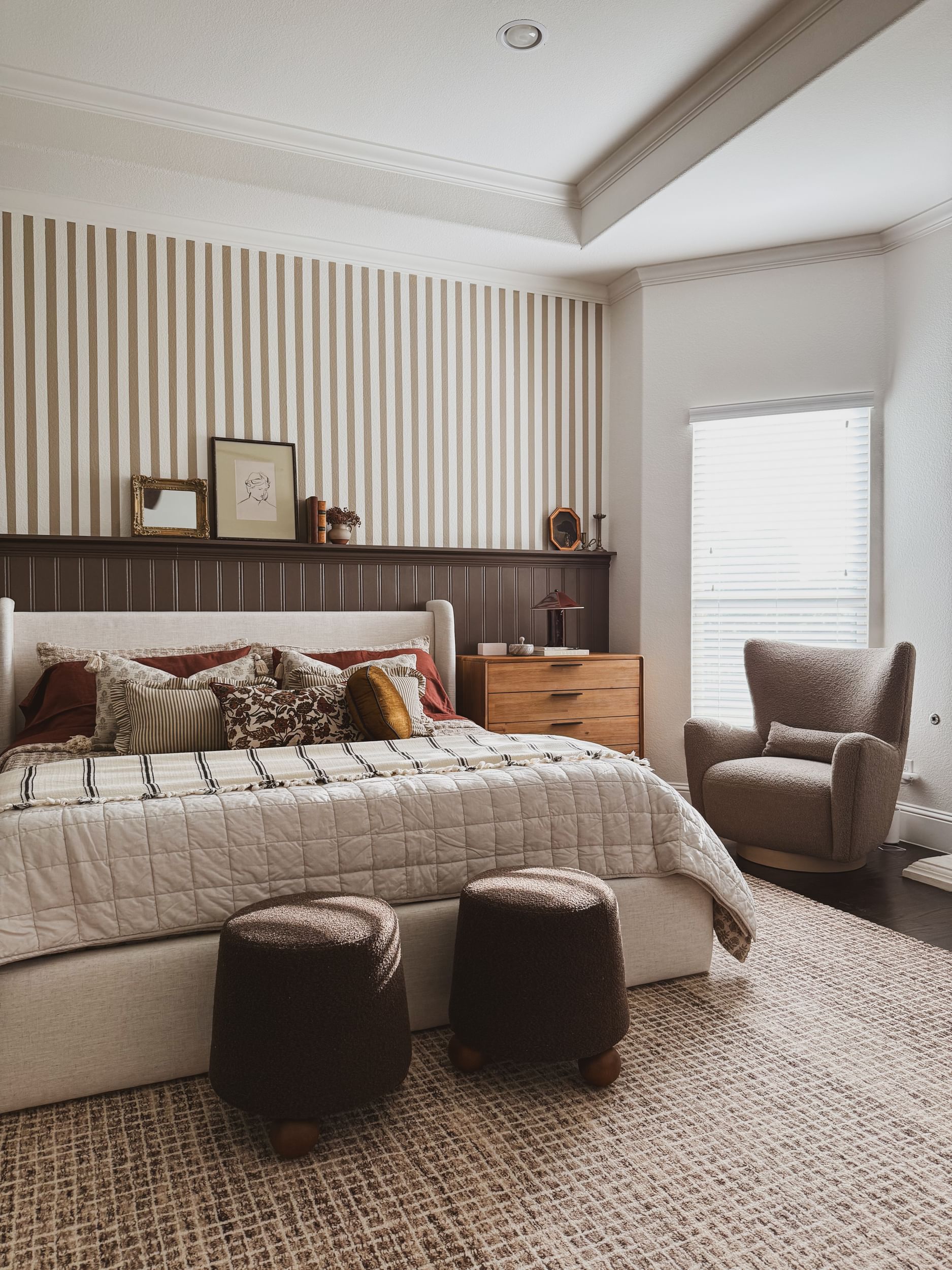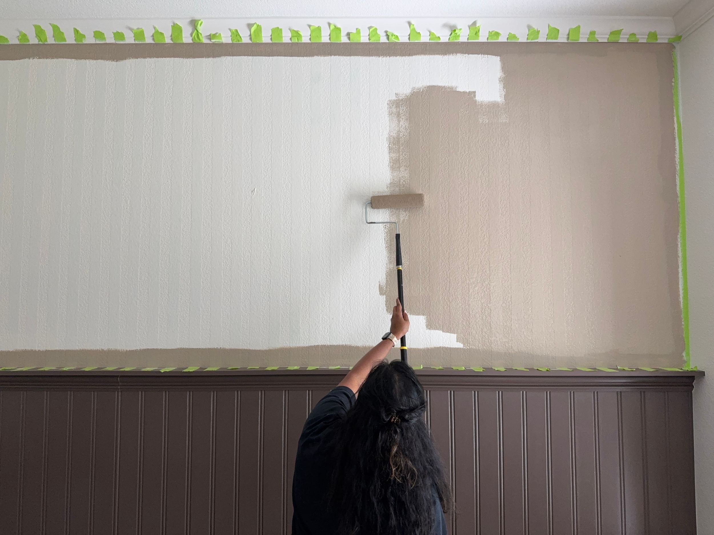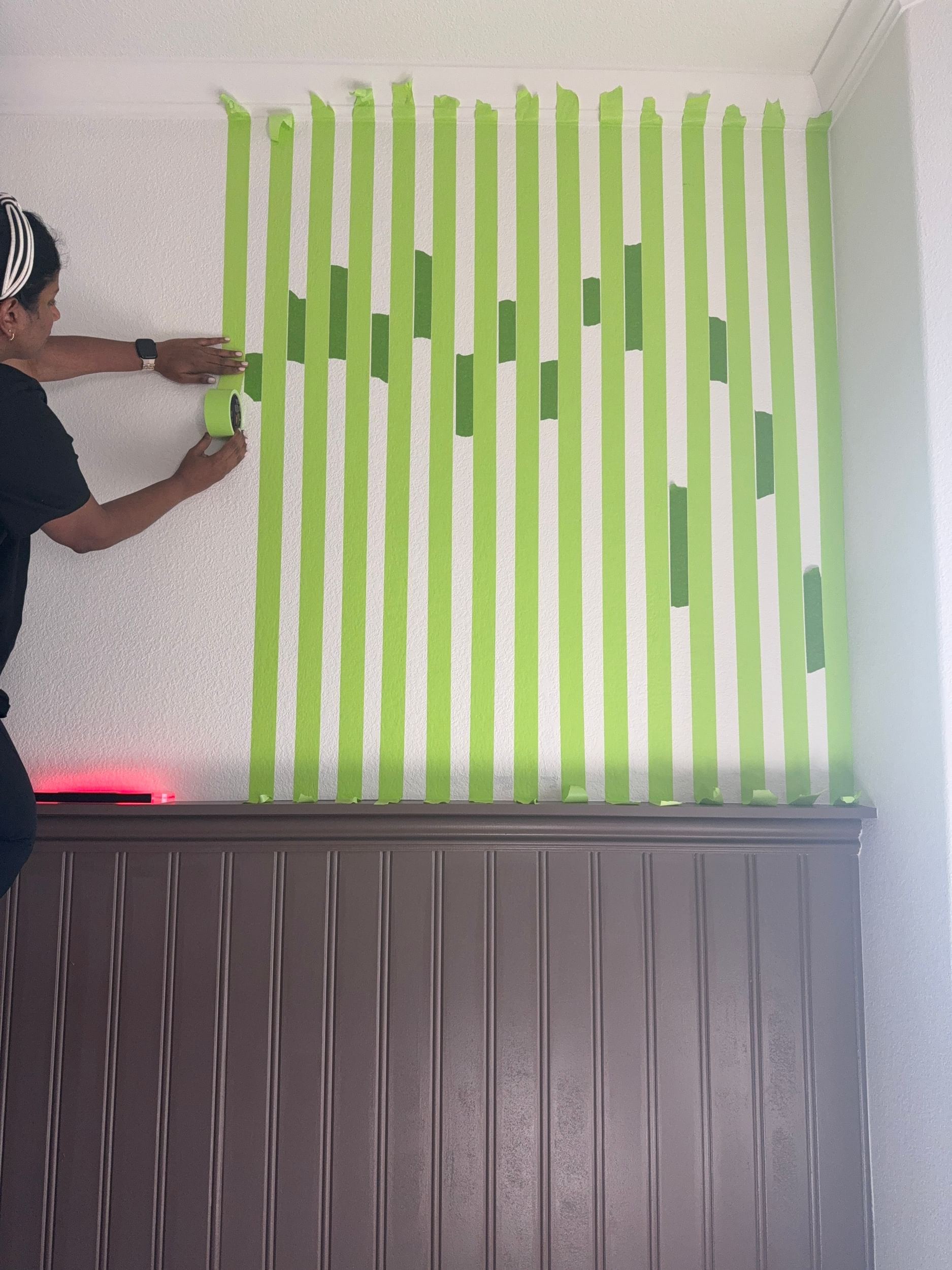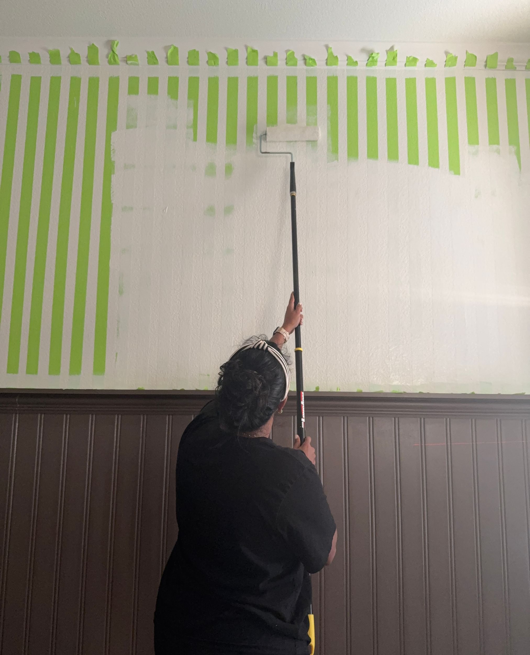 To add some fun in her space, Becky transforms the room by adding bold stripes to her wall.