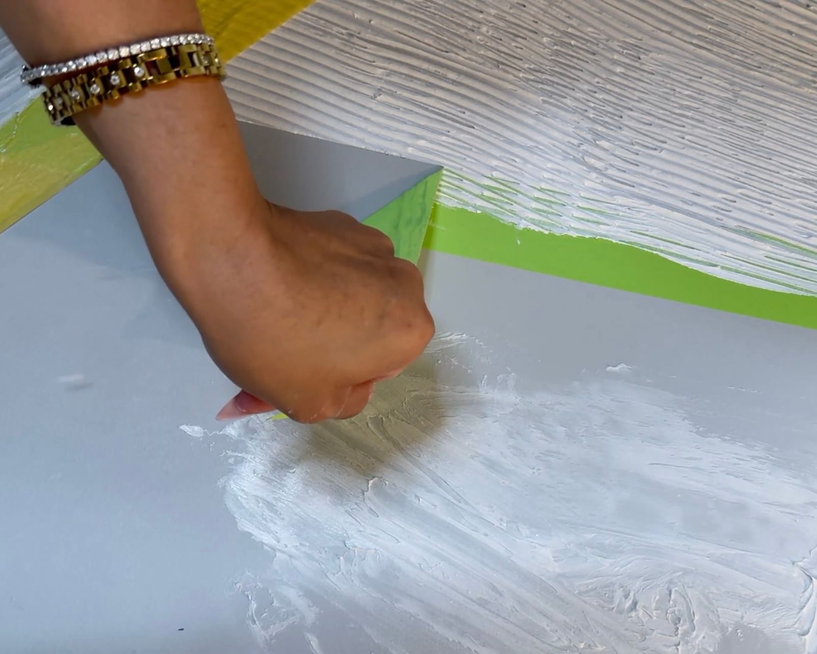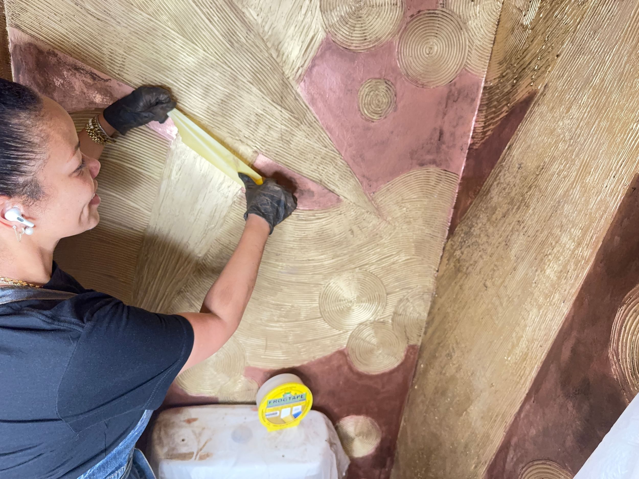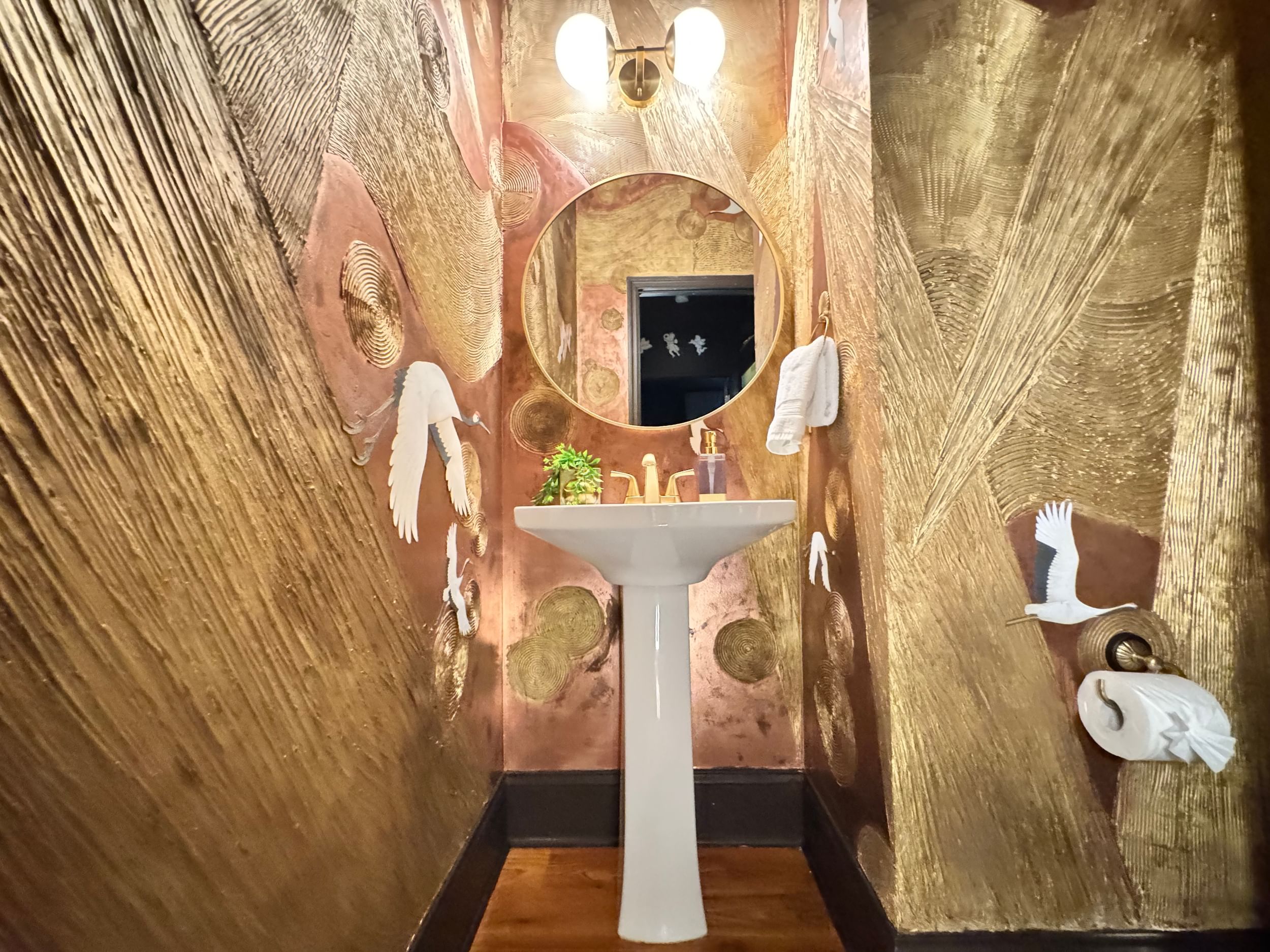 Lauren transforms a tiny powder bathroom into a show-stopping statement of maximalist metallic glam. Lauren packed this small space with big personality and luxurious detail. Her design features hand-carved textures, hand-painted mixed metallics and custom-cut wallpaper panels.