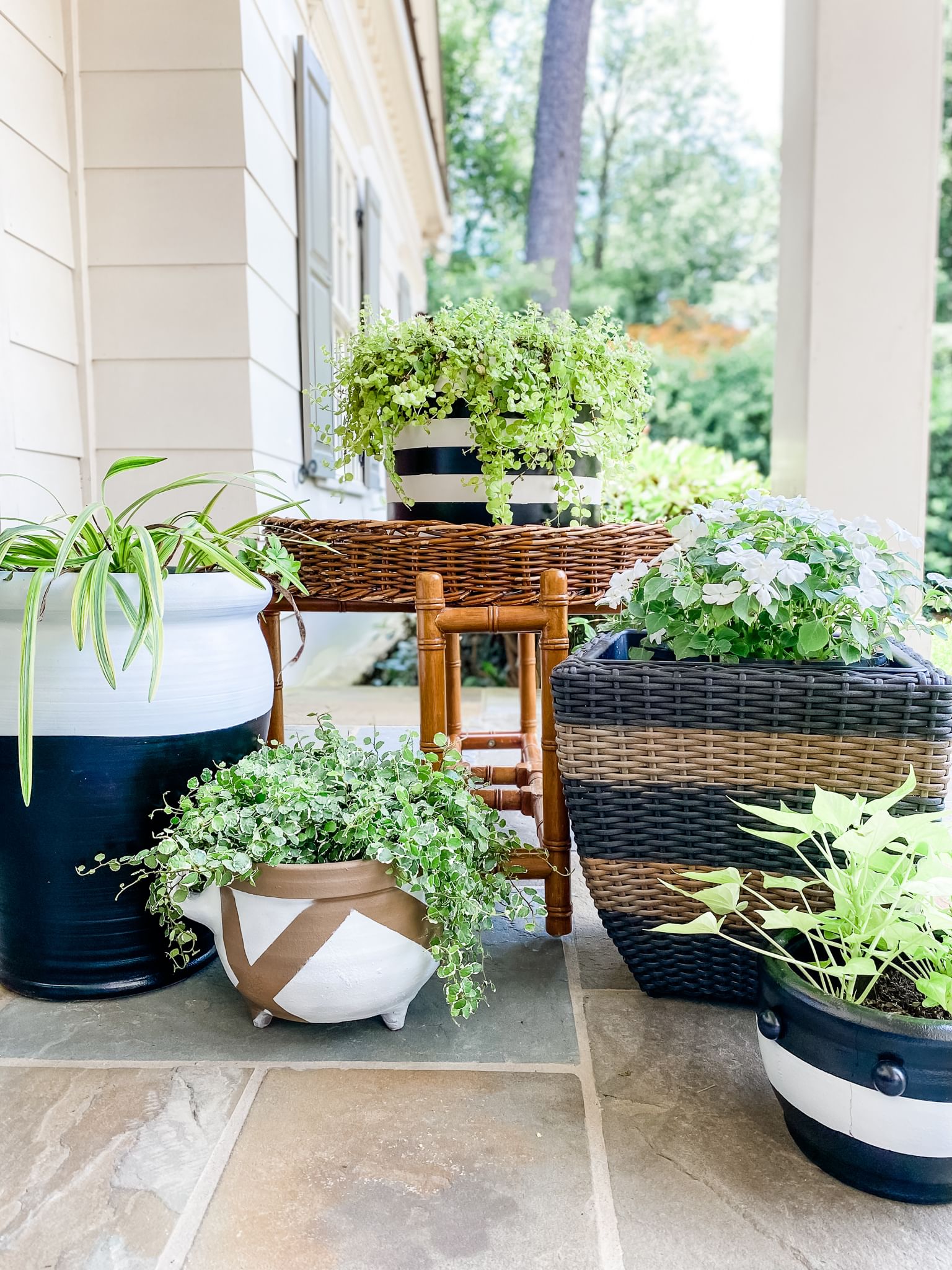 Plant beautifully bright blooms in pots and get the color-saturated garden of your dreams. Form a variety of patterns with different widths of painter’s tape and pick paint shades to complement existing patio furniture or throw pillows. Add texture with different brushes or stencils, choose pops of color to contrast with the petals or fresh green leaves, or use a variety of shades to create an ombre look.